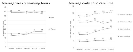 Despite these major changes in family policies in recent years, employment patterns have remained strongly gendered in Germany. As Figure 2 (left panel) shows, in 1995–2019, fathers worked roughly 38 h per week, on average. While mothers’ working hours increased over this period, mothers were still working only 17 h per week on average, or less than half the number of hours fathers were working. Correspondingly, mothers were spending substantially more time than fathers caring for their children (right panel of Figure 2). While mothers’ time investments declined somewhat in the 2005–2009 period—which is the period when the abovementioned reforms were rolled out—fathers’ time investments increased. Both fathers and mothers were spending more time with their children on the weekends (see also Samtleben 2019).