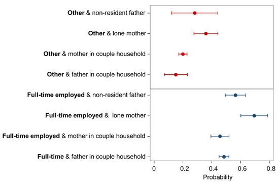 In a final step, we estimated an interaction model of employment status and family form. We did so to examine whether certain constellations, such as lone and full-time employed mothers, reported being under additional time pressure. As the sample sizes of part-time employed and non-working fathers were rather small, we had to group part-time and non-working into one category. Figure 3 reports the average predicted probabilities (AME) from this investigation. The figure clearly shows that the full-time employed parents were the most likely to report not having enough time to support their children than other parents (part-time and not employed parents). Of these parents, lone mothers, but also non-resident fathers, were especially likely to express concerns. Roughly 70% of the full-time employed lone mothers and 60% of the full-time employed non-resident fathers said they feel they cannot devote enough time to their children. By contrast, only about 20% of non-working or part-time employed mothers in couple households reported that they worry that they are spending too little time with their children. Although the interaction model is insightful, it should be noted that according to the likelihood ratio test the interaction did not improve the fit of the model significantly.