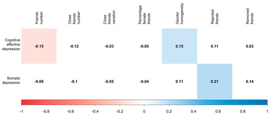 First, we calculated the bivariate Pearson correlation between friendship network and depression indicators. We only highlighted those coefficients in Figure 2, where the significance level was below 0.1.
