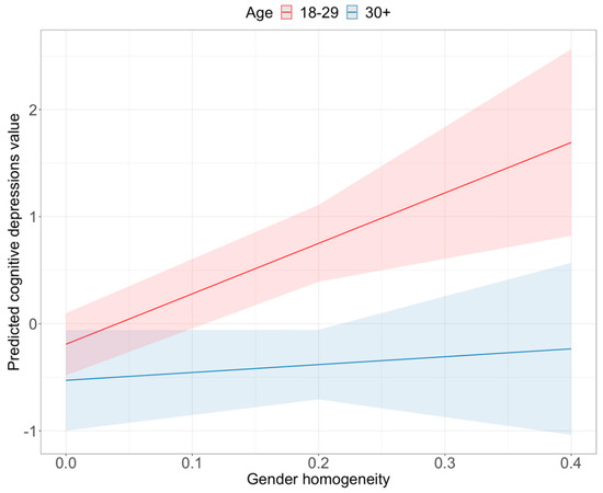 Interaction effect of gender homogeneity and age on cognitive depression (marginal models).