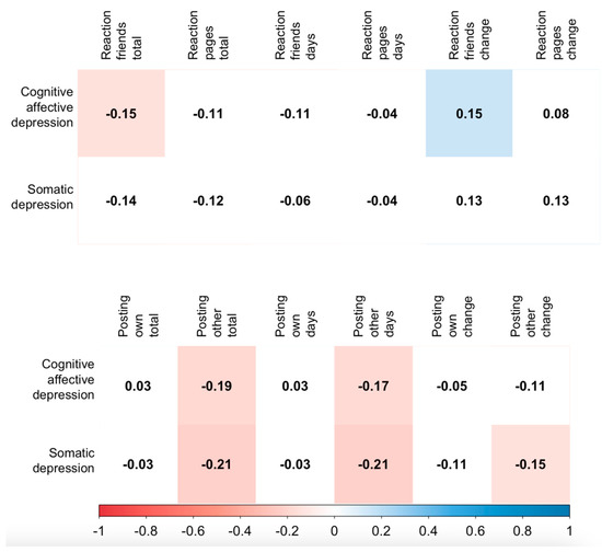 Most of the observed correlations were not significant. The volume of reaction on pages and posts on their own timeline did not correlate with any depression indicators. In the case of posts on others’ timelines and reactions on friends, we found a significant correlation with both depression types. Those who scored higher in depression scales had lower activity levels in these dimensions. We found a negative correlation between absolute change of posting on others’ timelines and somatic depression. It seems that those who had higher somatic depression levels posted less on others’ timelines, but the average volume of posting was more stable in their cases.