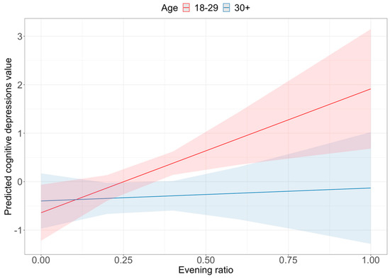 The interaction of the evening activity ratio variable and age was significant (p < 0.05), with a negative coefficient (Figure 6). The evening activity only affected cognitive-affective depression levels in the younger age cohort.