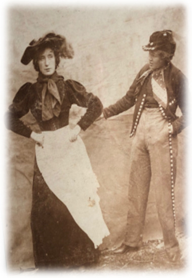 Women’s bodies during this time were judged through biological functions that inevitably collapse into social characteristics. While traditionally men have been thought to be capable of transcending the level of the biological attributes using their rational faculties, women have tended to be defined entirely in terms of their physical capacities for reproduction and motherhood. In the picture from Vera Holme’s childhood album (Figure 1), one can discern the upbringing conditioned by Victorian etiquette that formed an essential part of Vera’s childhood. Vera was schooled at a convent in Belgium. In the picture, she is seated with her brother and her mother stands tall wearing a quintessential Victorian gown. This picture is clearly reflective of the embodiment of gendered code of conduct embedded in Vera during her childhood that gets further entrenched during her schooling in Belgium. This becomes a crucial point of comparison in viewing her transition post her forays into theatre that I will discuss in the subsequent section.