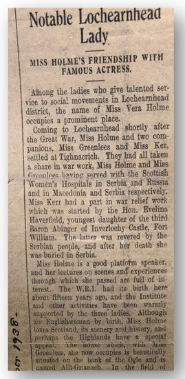 Article in Perthshire Advertiser highlighting Miss Holme’s ‘friendship’ with a famous actress of the time, 1938, Vera Holme Papers, Women’s Library, LSE, London.