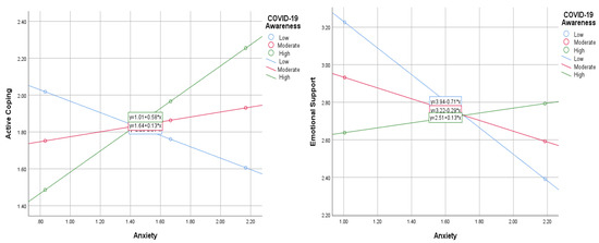 Using randomly generated values of the moderator, it was found that, at the highest point of COVID-19 awareness, there is a positive significant effect of anxiety on active coping, B = 0.577, SE = 0.122, BootCI (0.336, 0.818). The results also revealed that, with lower levels of COVID-19 awareness, the relationship between anxiety and emotional support was found to be negative, B = −0.708, SE = 0.133, BootCI (−0.971, −0.445). A pictorial view of the probing results is shown in Figure 1.
