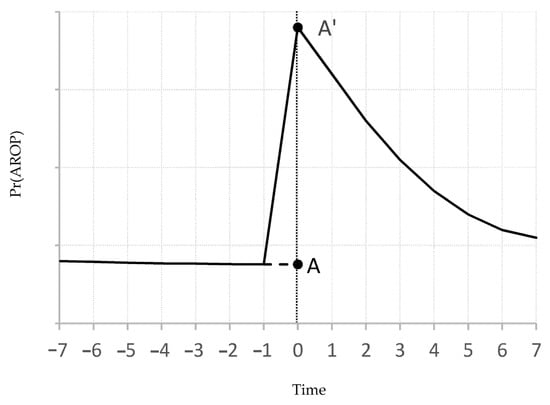 An illustration of the model through one possible trajectory of the probability of being at risk of poverty (AROP) surrounding the time of separation. Note: The model is composed of 3 indicators for “time”. The first is continuous and centred around the time of factual separation. The second is a dummy variable with the value of 1 for the postseparation period, the third is an interaction between the two. Point A is the predicted level had the separation not occurred.