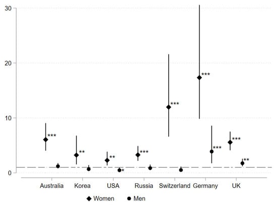Intercept effects of respondent’s country of residence on being at risk of poverty after relationship dissolution, calculated as odds ratios. Notes: * p < 0.05; ** p < 0.01; *** p < 0.001.