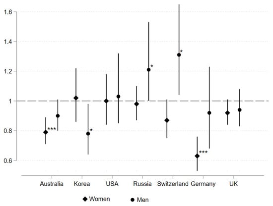 Finally, we evaluate our fourth and final hypothesis in the same way as the third hypothesis. Figure 5 shows the intercept effects of having children living in the household for each of the separate countries. Again, the effects appear to be gendered, with none of the countries showing significant effects for men. For women, the effects are significantly positive in Korea, Switzerland, and Germany. Considering the large confidence bounds for the estimates for Korean women, we cannot unambiguously confirm our fourth hypothesis.