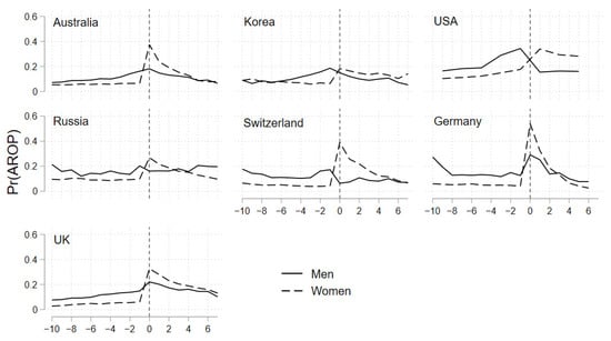 The third hypothesis cannot readily be evaluated from Table A1. Instead, model 3 was estimated with a different reference category for country in order to obtain the ratios and confidence bounds for the slope and intercept effects of each individual country. Figure 2 and Figure 3 show the estimated intercept and trajectory effects, respectively. To improve the readers’ understanding of what these results signify, Figure 4 shows the average estimated trajectories of the AROP separated by country and gender. Apart from highlighting the differences between men and women, these figures also show considerable differences between countries. For women, the parameters indicating the transitory nature of the effect of relationship dissolution on being at risk of poverty (i.e., an intercept odds ratio higher than 1 and a slope odds ratio lower than 1) were only found to be significant in Australia and Germany. While the Swiss and UK women’s estimators are not significant, they are substantively closer to the estimates for Australia than the estimates for Korean and US women. For German men, we find that the odds of being at risk of poverty are 3.9 times higher immediately after separation. For men in the UK, this is 1.7 times higher. The only significantly negative association with poverty risks is found for men in the United States, where the odds of being at risk of poverty are two times lower immediately after separation. Looking at the trajectory effects for men, we see significantly positive effects in Switzerland and Russia. For both countries there was a significant decline in the odds of being at risk of poverty prior to the separation. These were, however, reversed into an overall increase in the risk of being at poverty after separation, by a factor of 1.12 per year.