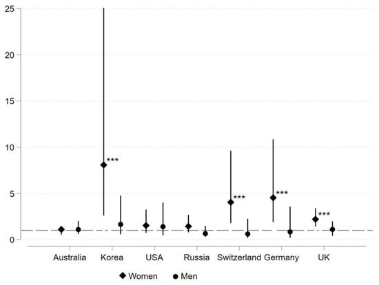 Focussing on the immediate increases in poverty risks for women, three clusters can be distinguished. By cluster, we mean countries for whom the intercept effects differ significantly from other countries, but not from each other. We distinguish the relatively low (Korea, USA, Russia; OR < 5), moderate (UK, Australia; 5 < OR < 10) and relatively high (Germany, Switzerland; OR > 10) clusters. In the high cluster, the increase in the odds of being at risk of poverty are around three times that of the low cluster. Taken together, these results confirm our third hypothesis.