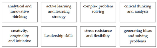 The third class of flexible skills includes cross-functional skills of employees that a person can independently develop on purpose by themselves or obtain along with professional experience. These skills include the social skills of employees (communication skills, emotional intelligence, and the ability of employees to persuade), skills in solving various complex problems, and systemic skills of employees (for example, the ability to make managerial decisions and the ability to approach the process of analysis systematically). Other skills considered include technical skills and skills in managing various types of resources (e.g., financial resources, material resources, human resources, and time resources). Silaban and Silalahi (2020) identify the critical flexible skills that will be in demand by 2025; they are presented in Figure 1. It can be seen that most of these skills are cross-functional, that is, available for purposeful self-development.