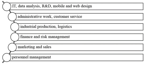 Today, employers’ need for employees to have flexible skills is directly related to the automation of production processes and the digitalization of the economy. Flexible skills are essential for employees to perform various work tasks in new areas of activity effectively. In particular, HR specialists name several areas of activity distinguished by a high level of digitalization of work processes. The availability of soft skills among employees will be a priority over the next five years. These areas of activity are highlighted in Figure 2.