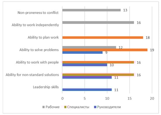 The following flexible skills were most in demand by Russian employers in 2020: the ability of an employee to learn, the ability of an employee to coordinate, the power of an employee to negotiate, the ability of an employee to transfer knowledge to colleagues, a high level of information literacy, the ability of an employee to focus on a customer, the ability of an employee to communicate effectively, the ability of an employee to solve complex tasks, functional literacy, and advanced time management skills (Karas 2021). This aligns with the Goal-Setting Theory discussed in (Latham 2003), in which soft skills are critical to attaining individual and group goals. The NAFI Research Centre assessed the needs of Russian employers for employees to have flexible skills (NAFI Research Centre 2018). Figure 4 shows the flexible skills that, according to the surveyed employers, are lacking in Russian employees.