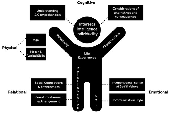 When considering the capacity of a child, age is a critical initial consideration. Though adamantly mentioned, age is not the only basis of a child’s capacity level but is nonetheless an important factor. There is large variations in the age at which a child should be deemed capable, with much of the literature involving family law maintaining that the age of twelve is the necessary standard of considering children’s voices (Bala et al. 2005). In contrast, other studies in the developmental psychology field note that children as young as three possess the capacity to give insight into their thoughts and views (Einarsdottir et al. 2009; Smart 2002). The discrepancy within the literature highlights that age cannot be the sole consideration of capacity. However, the age of the child can provide information about the developmental stages in that child’s life. For example, if you wish to speak to a child who is six and gain insight into their capacity, it may be helpful to know they are in what Piaget (1962) considered the preoperational stage, and in this stage, children are beginning to see things from the perspective of others. Though these stages may not always match the child’s physical age, this information is a sufficient starting point. Other physical considerations of a child may include their ability to verbalize and their motor skills. These are important initial considerations before divulging into the more in-depth elements. The verbal and motor abilities relevant to assessing a child’s capacity may include contemplations such as language or accents, speech production, the use of physical voice, articulation, and pronunciation. The verbal abilities of a child are critical to consider for their active participation. Children may lack the necessary vocabulary to describe their thoughts and perspectives though they possess a deep understanding (Einarsdottir et al. 2009) This presents a requirement of the time and materials needed in order to adequately meet children at their verbal level and provide means for them to express their thoughts. An example of this could be providing a child with drawing materials as an alternative way to express themselves. As mentioned, the motor skills of a child are not necessarily relevant to their capacity level but are simply another layer of the child’s abilities and experiences, which can provide insight into a child’s basic composition. One example could be if the child can hold a writing instrument or not, as this will indicate what they may be capable of in a potential assessment or when participating in a proceeding. If a child does have a physical disability, for example, they will need appropriate methods of accessibility in order to display their capacities in other ways. These can be determined in conjunction with the child, by asking them about their strengths and preferences. Such elements are primary considerations that should be assessed before diving into more intricate factors such as the cognitive, emotional, social, and relational elements.