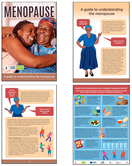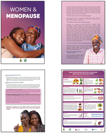 The following are available online at https://www.mdpi.com/article/10.3390/socsci11040143/s1, Figure S1: South Africa booklet ‘Menopause: A guide to understanding the menopause’ English web version. Figure S2: South Africa A3 poster ‘How should women look after themselves as they enter midlife?’ English web version. Figure S3: Zimbabwe booklet ‘Women & menopause’ English web version. Figure S4: Zimbabwe A3 poster ‘How should women look after themselves as they enter midlife?’ English web version.