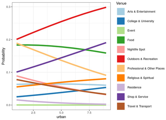 For instance, the probability of an event taking place outdoors or in a recreational venue increases as the urbanity of a zip-code becomes higher. Less surprisingly, the likelihood of an event taking place in a shop or service venue increases as the urbanity of a zip-code becomes higher. This finding can easily be explained by a greater prevalence of stores in more urban areas.