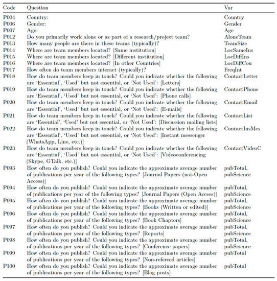 The objective was to analyze in what way the information and communication technologies have changed the manner in which scientists are related through 159 variables. For this analysis, the variables under consideration are in Figure 1. The survey contained of a mixture of open-ended, multiple-choice and Likert-scale questions and took approximately 15–20 min to complete.
