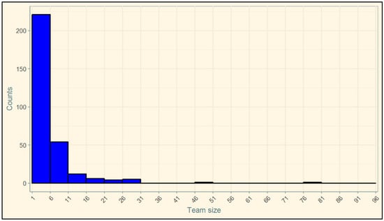 The first question of the analysis is how researchers work: individually or collectively, alone or in a research team. In total 49% of them (n = 150) prefer to work as part of a scientific group, and just a minor number of academics, 6% (n = 19), work totally alone. In total 45% (n = 136) of the participants prefer to work in both ways (collectively and alone). The dimension of their academic team is between three and six researchers (63%, n = 191). Only 34% (n = 80) of the scientists work in teams that have more than six members (see Figure 3).