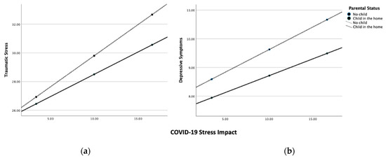 COVID-19 stress impact predicting traumatic stress and depressive symptoms by parental status. (a) First figure to the left showcases the association between COVID-19 stress impact with traumatic stress by parental status; (b) the second figure to the right showcases the association between COVID-19 stress impact with traumatic stress by parental status.