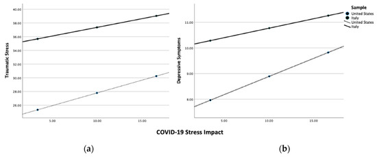COVID-19 stress impact predicting traumatic stress and depressive symptoms by nationality. (a) First figure to the left showcases the association between COVID-19 stress impact with traumatic stress by nationality; (b) the second figure to the right showcases the association between COVID-19 stress impact with traumatic stress by nationality.
