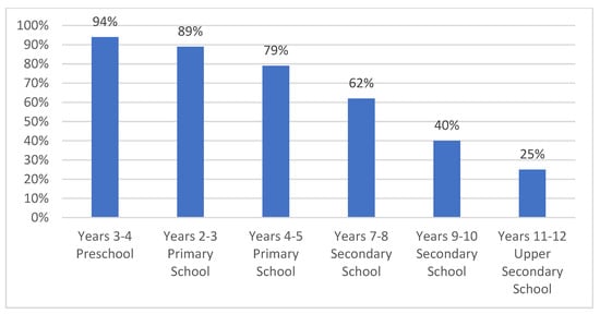 Access control shows a positive association with age as evidenced by the statistical contrast performed (Chi = 218.27 df = 5 p < 0.001, Cramer’s V = 0.540 p < 0.001). This question is focused on minors who have to ask for permission before connecting. As minors grow older, their parents exercise less control over their access to the Internet. Looking at the results by age, it can be seen that 94% of the minors in the third year of preschool (4–5 years old) cannot connect without parental permission, the percentage of minors in years 2 and 3 of primary school drops to 89%, and again is reduced in the case of minors in years 4 and 5 of primary school (79%). The percentage continues to drop as parents of older minors are surveyed. With the onset of secondary school, when minors are 12 years old and attend years 7 and 8 of secondary school, 62% cannot connect without the permission of an adult. In years 9 and 10 of secondary school it drops significantly to 40% and when they attend years 11 and 12 of secondary school, at 16–17 years of age, only 25% of minors have to ask for permission to connect. Therefore, the older the minors become the less they are controlled on their access to the Internet (see Figure 1).