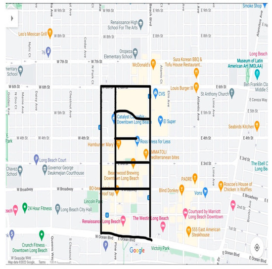 These discussions led to the guiding question for the project: How does capital accumulation change space? We explore this question by using walking to observe how urban renewal development has changed neighborhoods with large populations of immigrants and residents of color in Long Beach. To prepare to walk the neighborhoods, we first found maps to identify the street boundaries of the area and created a walking map of the streets (see Figure 1, Figure 2, Figure 3 and Figure 4). With maps of current and future LB development projects in the neighborhood and key development projects, we created maps as guides for our walking. We also brought our cameras to photograph the urban development projects as visual ethnographic field notes. In addition, photographs allowed the entire team to examine the neighborhood changes together and identify recurring themes and thus also participate in the immersive method of walking. However, for this paper, we are focusing on solely reporting the findings from our observations walking each neighborhood.