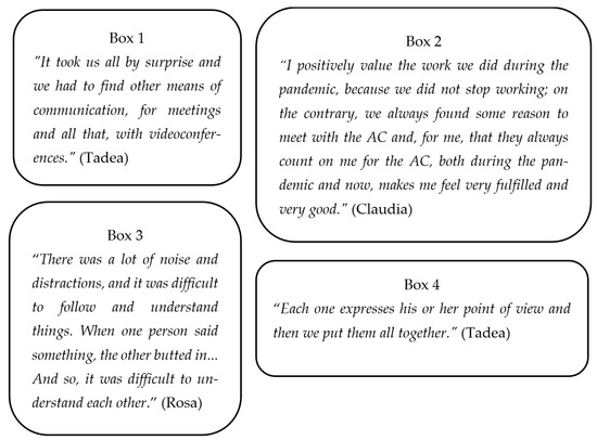 The research was carried out between February and October 2021. Due to the restrictions derived from the COVID-19 pandemic, the work was carried out online, which meant a different way of working compared to what used to be the normal operation of the AC (Figure 1, box 1). The videoconference meetings had the virtue of maintaining the activity of the AC during the time of restrictions (Figure 1, box 2), although technical problems had to be solved (connection, audio, etc.) (Figure 1, box 3) that conditioned some decisions, for example, to work on some phases of the process in small groups in order to facilitate communication between the co-researchers (Figure 1, box 4).