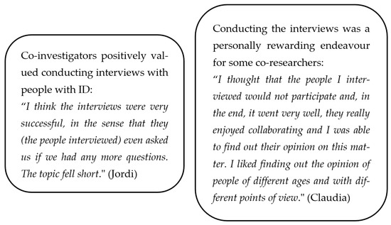 In this inclusive study, the role of the academic researchers has been to support the co-researchers throughout the research process. They were supported in choosing, exploring, and discussing the topic, collecting data on the topic through interviews and discussion groups, and analysing the results obtained. The academic researchers were also responsible for organizing the working meetings held with the co-researchers. This article was written mainly by the academic researchers after holding two working meetings with the co-researchers at the end of the research process with the aim of including their voices in this article. In the first meeting, after positively evaluating the possibility of publishing this article and its implications, the co-researchers reviewed the research process carried out and assessed different elements (study topic, methods used, current situation regarding the study topic, etc.). Their evaluations were later analysed by the researchers and included in the article in the form of vignettes. In the second meeting, the researchers presented the different sections of the article to the co-researchers in an accessible format in order to assess their content. They were also shown their contributions in the different sections so that they could decide whether they agreed to include them. Finally, they decided if they wanted to use pseudonyms and if they wanted to participate as authors of the article. The co-researchers agreed with the information provided in the article, they decided to include all the vignettes proposed by the researchers that included their points of view; and they chose their own pseudonyms—these appear in the vignettes that expose comments made by the co-researchers on different topics, such as the methods used in the research (“Materials and Methods” section) or the importance of researching on interpersonal relationships in times of pandemic (“Discussion” section).