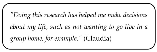 In relation to the subject of this research, the co-researchers emphasized the importance of personal relationships and the seriousness of social isolation; a feeling of loneliness that some of the co-researchers claimed to have felt. Co-researchers also reported that the restrictions imposed during the toughest times of the pandemic are still in force for many of them, especially those who reside in institutions, and that it is necessary to report the rights they have lost, such as being able to go alone to different places, being able to choose which leisure activities to carry out during their day to day lives, or going to friends’ houses to eat, among others. In any case, they considered that participating in this research has allowed them to better understand the situation they are experiencing and, in some cases, make decisions about their lives based on the knowledge acquired (Figure 5).