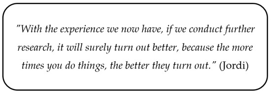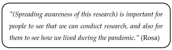 Some co-researchers valued this inclusive research experience as an opportunity to make their role as researchers and the situations that people with intellectual disabilities have experienced during the pandemic known to society (Figure 6). In general, the entire team agreed that inclusive research has had an impact that goes beyond traditional research. Not only it allows us to share experiences and opinions between academics, non-academics and people of different ages and backgrounds, and learn from each other, but also to socialize and feel understood during a difficult time such as a pandemic.