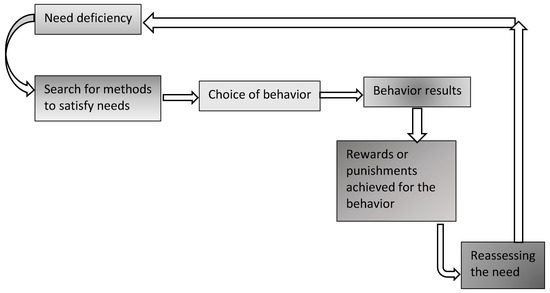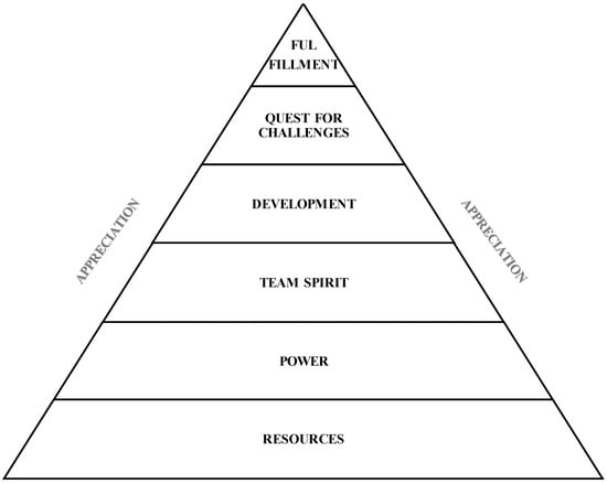 The lower-order needs (external motivations), such as physiological and safety needs, are intrinsic to human nature. They are prepotent to higher-order needs (inner motivations) such as love, esteem, and self-actualization. Although higher-order needs may be as basic and intrinsic to human nature as lower-order needs, only a small number of people experience them. It is, therefore, challenging for managers to meet the higher-order needs of their employees in practice, since these needs are different in every individual. Motivated employees experience internal tension due to unsatisfied needs, and this tension drives need satisfaction. The stronger the drive, the greater the efforts made to achieve the goal (). A good leader recognizes this and reconciles organizational goals to individual motives, thus, making it possible to use tension-reducing behavior to realize the objectives of the organization. According to (), Maslow’s hierarchy is better represented as a dynamic circle that can optimize wellbeing. The COVID-19 pandemic has demonstrated that human wellbeing and health depend equally on biological, psychological, and social factors and that these interact dynamically. The characteristics of hierarchy of needs models were analyzed in detail by (). His paper has been cited in many publications as providing a good description of the theoretical background (e.g., ).