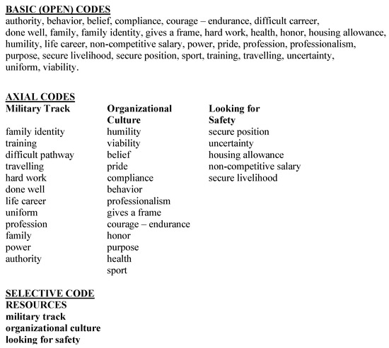 RESOURCES, which is the first selective code, is associated with being a soldier and formed the central element of the narratives in a unique and peculiar way. All the self-narratives dealt with the diversity of the military track (i.e., career), from family identity to career, that can be achieved through self-belief. The diversity of the military career is indicated by military training, during which the individual’s military socialization begins. In addition, a military career is also a difficult career, which requires hard work and power and which must be done well. This basic category also reflects the professionalism associated with a life career, which is a possible main motivation for joining the army. The family is a reference entity, which also represents an identity as a basic RESOURCE. Thus, profession and family are both important to the soldiers, and there is no way to choose between them. The only way is to find a balance. RESOURCES also encompass authority, since the soldier reflects authority itself and, as weapons of authority, soldiers defend their homeland even by the sacrifice of human lives, in which patriotism is the dominant factor. This is also associated with the uniform, a symbol that mediates values, such as belief and camaraderie, which are elements of everyday military service.