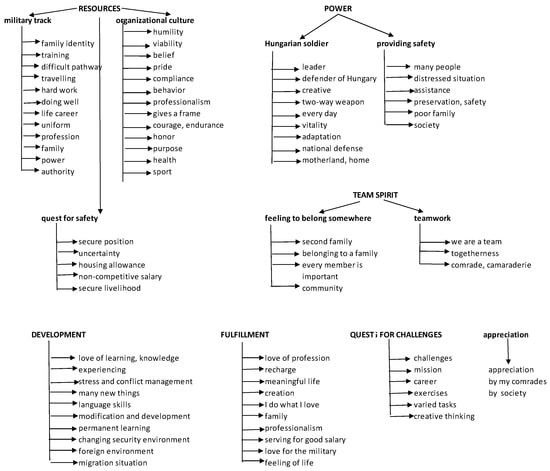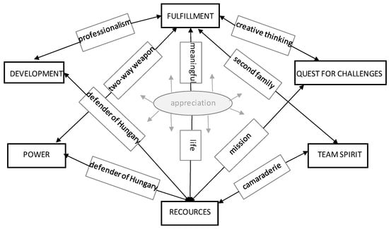 Meaningful life, as a military feeling, representing FULFILLMENT, makes it possible for soldiers to do what they like doing, allowing them to become recharged and, thus, improve their professionalism. Family, as well as being present as a feeling of belonging somewhere, is mentioned in the narratives as the soldier’s own family, suggesting that a high level of self-knowledge and need drive the quest for happiness and self-realization that can be achieved even in the Hungarian Army. Elements of FULFILLMENT, such as serving for a good salary, love of the profession (“I can do what I love doing”), providing safety for the family, and love for the military profession, were true values among the soldiers and factors that contribute to their satisfaction. A feeling of life frequently results in the creation of new thoughts and solutions and the fulfillment of the requirements of military service.