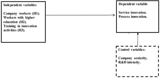 The research examines the relationship between the variables of human capital and innovative performance using data from Ecuador. Two types of service and process innovation are considered because human capital can influence differently depending on the type of innovation (Buenechea-Elberdin et al. 2017). In the literature, variables have been identified that can affect the innovation in a company, such as the variable company seniority because older companies may have more accumulated knowledge (Lefebvre et al. 2015), and the variable R&D intensity measured in R&D/sales expenses considered a measure of the absorption capacity of the company due to the fact that companies with more expenses in R&D they can develop greater skills and knowledge (Cohen and Levinthal 1990; Laursen and Salter 2006). The innovation capacity of a company can also vary according to its characteristics such as its size, industry, and area of activity (Civelek et al. 2021) or by the type of investment in innovation (Lewandowska 2021). Figure 1 shows the relationship of the variables identified in the literature review.