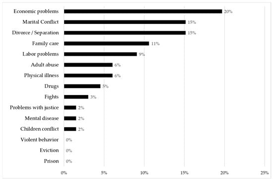 As we can see in Figure 1, the most frequent negative life events that participants suffered in the last three years were economic problems (20%), marital conflict (15%), divorce or separation from the spouse (15%), and taking care of a relative (11%). In the past, the main negative or stressful life events were also economic problems (33%), followed by problems at work (30%) and abuse in adult life (15%).