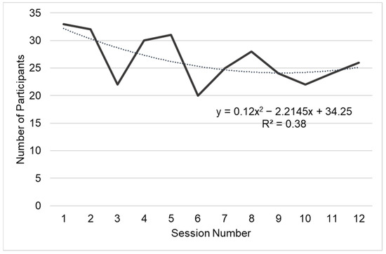 The IBM SPSS—26 and MS Excel programmes were used for data analysis and graphical representation. Statistical assumptions for parametric analyses were checked in accordance with the recommendations of (). After verifying the assumptions of normality, univariate, and repeated measures, ANOVA or t-test were used to compare the results between groups. In the case of comparison of nominal variables, the chi-square test was used. Linear regression was used to analyse the evolution of the number of participants per session. Results were considered significant if p ≤ 0.05. The effect size was calculated to clarify the degree of accuracy of the statistical judgments and the strength of the relationships between the variables.
