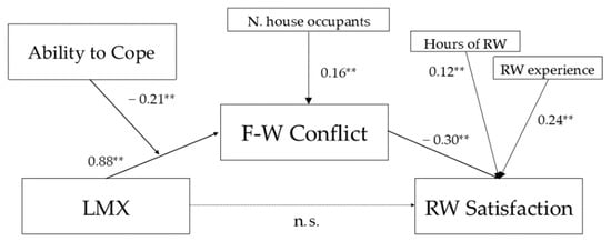 Figure 1 shows the tested model and reports the values of the control variables having a significant effect on the model testing. About this last point, it is noted that the number of house occupants showed a significant effect on FWC (B = 0.16; p < 0.01). Furthermore, the hours per week of remote working (B = 0.12; p < 0.01) and the experience of employees with the RW (B = 0.24; p < 0.01) was positively related to the RW satisfaction.