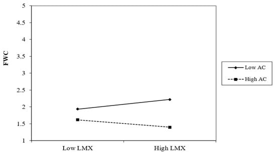 We tested the hypotheses of this study by running the moderated mediation model in PROCESS for SPSS, controlling for gender, age group, hours in a week spent working remotely, the number of house occupants, and experience with remote working. Figure 1 shows that LMX was significantly but positively related to FWC (B = 0.88; p < 0.01), thus supporting Hypothesis 1 for the existence of a significant relationship, but showing a direction opposite to the hypothesized one. In contrast, LMX was not associated with RW satisfaction (B = 0.07; p = 0.14), not supporting Hypothesis 2. The relationship between FWC and RW satisfaction was instead positive and significant (B = 0.30; p < 0.01), supporting H3. The mediation hypothesis (H4), according to which LMX relates through FWC with RW satisfaction, was not supported. The conditional effects of X on Y at each level of AC were not significant, although a comparison of these not-significant indirect effects showed significant differences among them (index of moderated mediation B = 0.06; [0.01; 12]). Hypothesis 5 was instead supported because AC moderated the relationship between LMX and FWC (B = −0.21; p < 0.01), albeit with a different sign from that hypothesized. Given the opposite sign resulting from H1 and H5, this result was coherent with the hypothesized reasoning, because AC shows anyway to be a resource for workers when considering the relationship between LMX and FWC. Figure 2 shows the plot of the moderation of AC on the relationship between LMX and FWC.