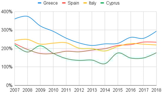 The term NEET refers to people with vastly different risks of entering and leaving the category. In particular, the youth at a greater risk are those who share key characteristics that expose them to the worst consequences (). As we described in the previous section, the academic literature identifies one subgroup as especially vulnerable: migrant women aged 25–29 (; ). Therefore, we checked first that it was also a fact in the MED EEA countries. Figure 1 corroborates that the characteristics of migrant women aged 25–29 constituted risk factors in the countries of the MED EEA during the research period. It shows that those who shared these characteristics had a higher risk of being a NEET than a random young person. Before the 2008 financial crisis began, the likelihood of being a NEET for the people with the selected characteristics in comparison with the rest of the youth was at its peak in the MED EEA countries, with the exception of Spain. Figure 1 shows that the situation changed after the crisis hit. However, it bounced after the worst part of the crisis, and this trend continued until the end of the study period.