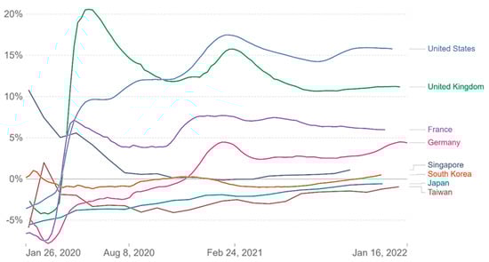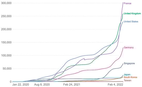 Figure 1 presents statistics on COVID-19 infections in major countries as of 4 February 2022. The differences in the daily numbers of new infections in the representative developed countries—the United States, the United Kingdom, Germany, and France—and in the countries representing the middle powers—Korea, Japan, Taiwan, and Singapore—are significant, as clearly illustrated in