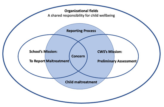 This study was informed by theories of human service organizations and child welfare social work, highlighting tensions between support and protection in service provision. In the linked processes that were the focus of this study, there is an interaction between professionals in two organizations with different organizational logics. In both, professionals serve community members (children and their parents) or clients while serving the interests of their respective organizations (Lipsky 1980). Activities in these organizations also may be administrative and even impersonal, based on norms and values persisting within them (Johansson 2002). Thus, the professionals interacting in a child welfare reporting situation are also bearers of the ideas and traditions from the respective organizations. In the theoretical model (Figure 1) that we developed for this study, organizational fields (Hjortsjö 2005, p. 27) are supposed to collaborate even though the missions of schools and CWS are delimited upon separate legislation, regulatory frameworks, and models of thought (cf. Lindqvist 2000). In a reporting situation, various forms of interaction usually take place between school staff and social workers in different human service organizations, which are under political, bureaucratic, and legal control (Hasenfeld 2010; Johansson et al. 2015). Thus, the professionals interacting in a child welfare reporting situation are also bearers of the ideas and traditions from the respective organizations.