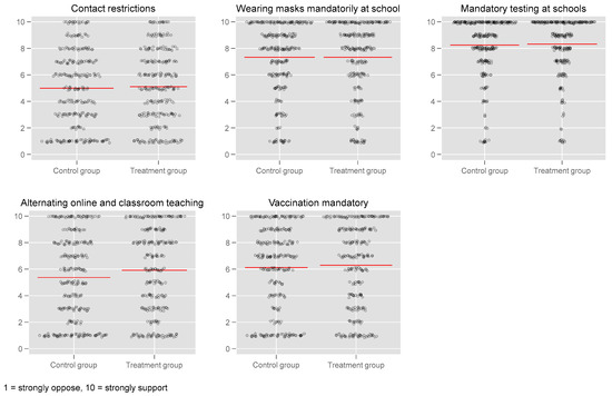Figure 3 also shows that there were certain differences in the approval ratings between the control and the treatment group. This suggests that for all five measures, support was higher in the treatment condition, yet only for the alternation of online and in-classroom teaching was this difference significant at the 95% confidence level (t-test: p = 0.0442; Mann–Whitney U test: p = 0.0390). For the other four approval rating variables, the differences between the two groups were much weaker (mandatory vaccination) or virtually nonexistent (contact restrictions, mandatory masks, and mandatory testing).4 The experiment therefore only partially supports the earlier findings by Lammers et al. and Jäckle and Ettensperger that the reduction in the EGB via educational nudges has further implications for the participants’ perceptions of protective measures. For most measures, the differences found were too small to demonstrate a real educational nudging effect.