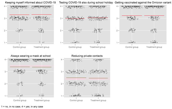 With respect to the willingness to perform specific anti-COVID-19 measures, the school students were particularly supportive of wearing masks at school, keeping themselves informed about the pandemic, and also getting vaccinated against the Omicron variant. Testing for COVID-19 during school vacations received slightly less approval, while the question of whether participants would voluntarily reduce their own private contacts produced by far the clearest split between the two groups. However, for all five variables, the differences between the control and treatment groups were very small and not significant, irrespective of whether the variable was treated with an ordinal or interval scale.5 These bivariate results show that a more realistic assessment of infection dynamics induced by educational nudges did not lead to divergent views about the school students’ future behavior with respect to the COVID-19 pandemic.