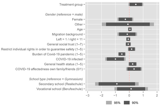 The regression model shows that the effect of the educational nudges in the treatment group remained relevant, at least by trend, even when controlling for other factors. It came close to the targeted α-level of 0.05. The point estimate could thus be interpreted in the following way: Receiving the educational nudges increases the approval of alternating online and in-classroom teaching ceteris paribus by an estimated 0.47 points. Some of the control variables showed stronger effects. All other things being equal, the participants who felt no high burden because of the pandemic and who had COVID-19 previously exhibited higher approval. The same was true, at least by trend (α = 0.1), for those school students who viewed their general health status as rather poor.