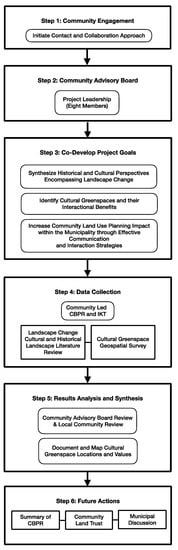 This study actively co-produced knowledge through participatory research and community leadership and engagement. This study used a mixed-method approach including both quantitative and qualitative data collection and analysis to generate information. The methodological framework for this study is presented in Figure 1. In Step 1, strategic community engagement and internal leadership led to the formation of a core community advisory board in Step 2. In Step 3, a set of project goals were established. In Step 4, a literature review documenting historical information and current concerns regarding land use change and environmental justice were documented and a geo-questionnaire assessing greenspace interaction to human wellbeing benefits was operationalized. Step 5 included the analysis and synthesis of results co-completed with the advisory board including a greenspace map. Finally, Step 6 outlined a set of next steps for engagement with the Municipality.