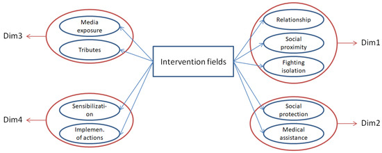 The firefighters who deal closely with the population have a privileged role and articulation with other entities, being able to collaborate in the provision of aid and assistance as with the transfer of the person infected with COVID-19 after discharge. This social proximity on the part of firefighters generated a network of solidarity on the part of the fire departments towards the community in which initiatives emerged that met the problems hitherto evident in society—problems related to isolation, social inequality (lack of assistance and protection for the most vulnerable and households in which there was a shortage of support and personal and/or financial resources, as well as essential goods), and a lack of reliable information (Long et al. 2022; Schuetz et al. 2021). The lack of response from governmental entities and the need to find solutions to problems made organizations such as volunteer firefighters seek to find innovative solutions to mitigate the social impacts of the pandemic. The initiatives launched by volunteer firefighters in Portugal can be grouped into several fields of intervention, which allowed us to build a framework based on four dimensions: (i) DIM1: relationship, social proximity, and fighting isolation; (ii) DIM2: social and/or intersectoral protection and medication assistance; (iii) DIM3: media exposure and a tribute to public–private entities involved in fighting COVID-19; and (iv) DIM4: sensibilization and implementation of actions within the scope of COVID-19 containment. These lines of intervention by volunteer firefighters during the pandemic represented in Figure 1 are aligned with the social needs of the most affected and vulnerable people during the pandemic. In Niu and Xu (2020) and Williams et al. (2021), the importance of initiatives to combat the isolation caused by COVID-19 as a way to mitigate social distancing policies to contain the spread of the pandemic is highlighted, while in Strasser et al. (2021) the role of public–private initiatives in implementing sustainable policies to combat COVID-19 is highlighted. Seddighi et al. (2021) extend this view by presenting a model based on the four Ps (i.e., public-private-people-partnerships) in which the role of governments, in reducing barriers to cooperation, is highlighted in a way that will contribute to enabling greater cooperation between the public sector, private sector, and population. The empirical data collected by Seddighi et al. (2021) show that this collaboration between these three entities is higher in times of disasters versus in normal everyday scenarios.