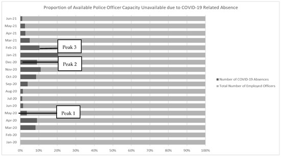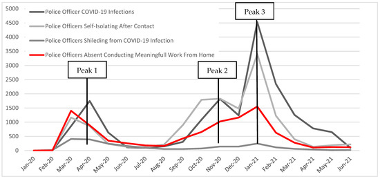 Reported police officer absences and peak infection periods vs. police officers conducting meaningful work.