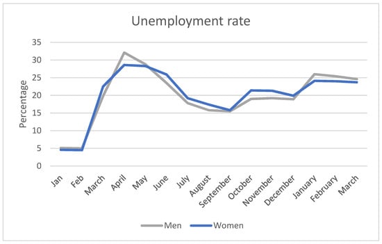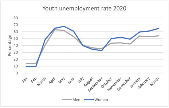The youth unemployment rate peaked at a much higher rate of 64% in May 2020 (Figure 2). This was slightly higher for women than men, and the discrepancy widened during the rest of the year. In March 2021, the youth unemployment rate was 65% for women and 54% for men.