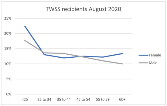 The proportion of each age cohort in receipt of the Temporary Wage Subsidy Scheme in August 2020. Source: Revenue Commissioners, Available online: https://revenue.ie/en/corporate/information-about-revenue/statistics/number-of-taxpayers-and-returns/covid-19-wage-subsidy-scheme-statistics.aspx (accessed on 1 October 2020).