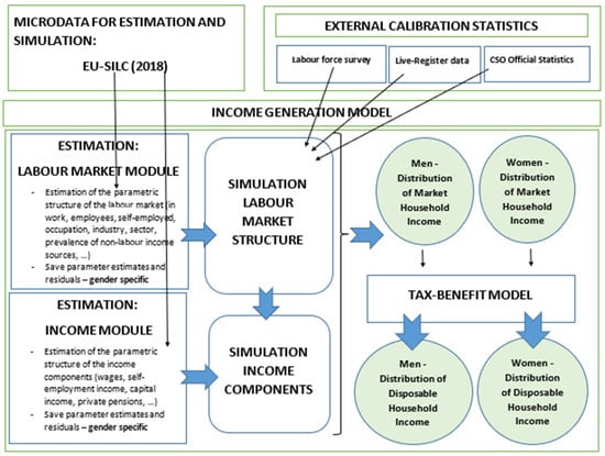 - An income generation model (IGM) to characterise and simulate the distribution of household income and its subcomponents;